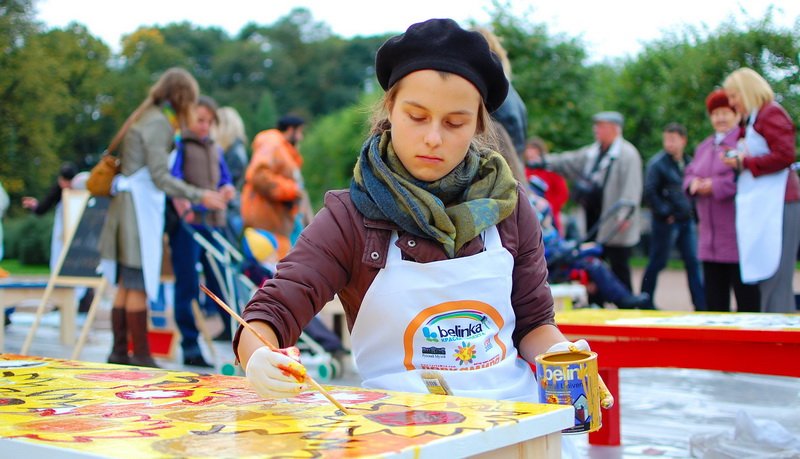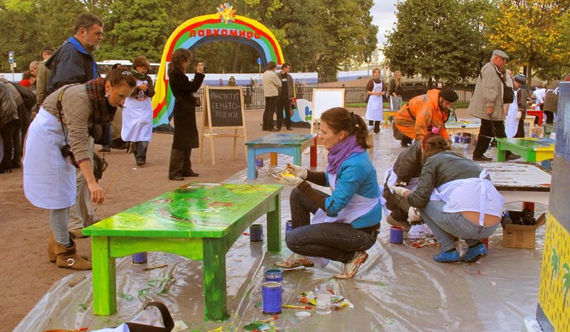 18 сентября 2010 года с 10.00 до 18.00 состоялась роспись лавок в Михайловском замке Русского музея. Среди деятелей искусства, которые приняли участие в проекте директор Русского музея В.А. Гусев, М.С. Боярский, Екатерина Волкова и другие, а так же видные художники Санкт-Петербурга. В течение одного дня каждый из них расписал лавку размеров 1м 70 см x 70 см. Тема росписи: «Мир как состояние. Мир как проявление. Мир Вам». Две лавки расписали юные художники из арт-терапевтической студии школы-интернат № 20 и студии творческого развития «Арт-Ателье Палитра». У стен замка художники керамисты и гончары дали мастер-класс для горожан.