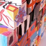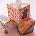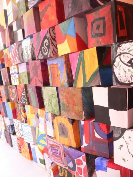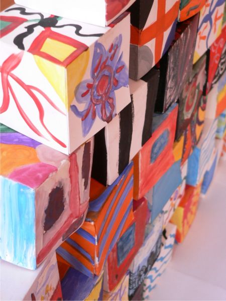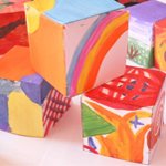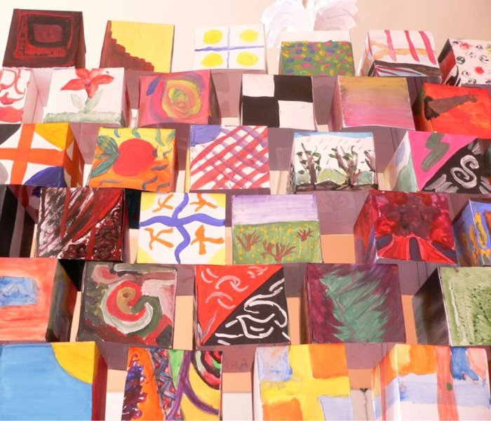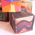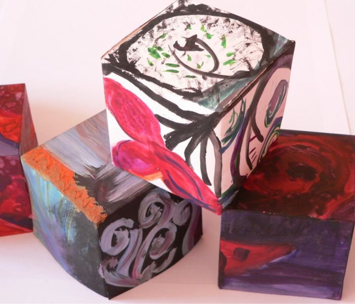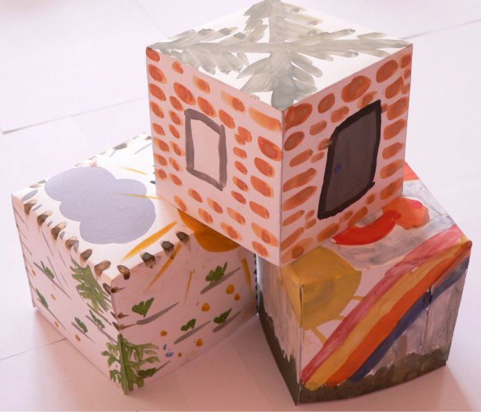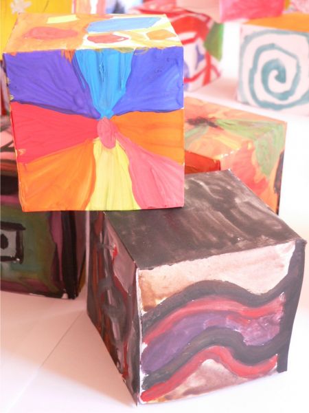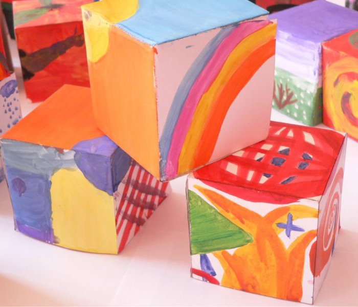 Следующий этап акции проходил в классе. Детям были выданы бумажные кубы без одной стороны, чтобы можно было надеть их на руку и рисовать. Так происходило обучение объемному рисунку и дизайну.