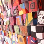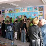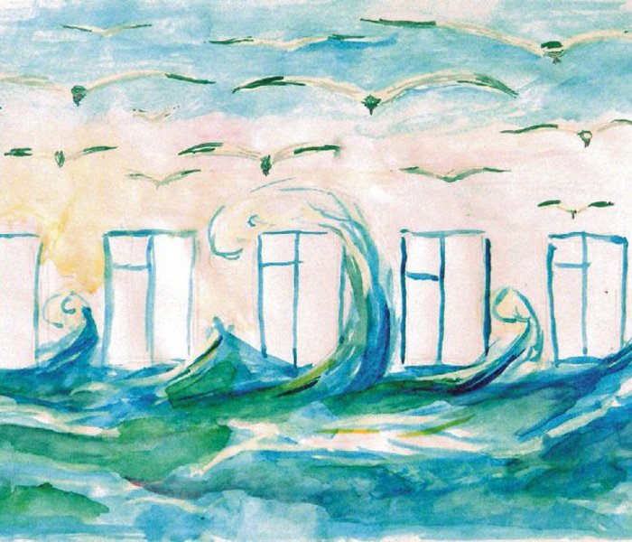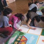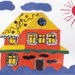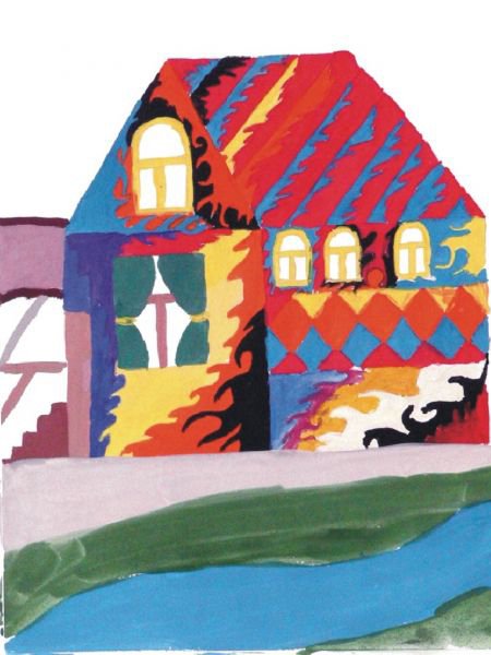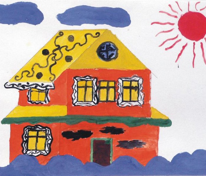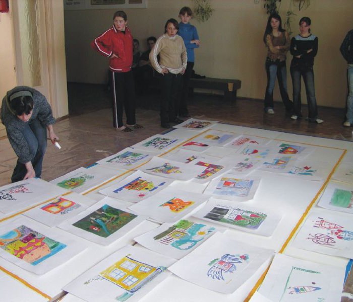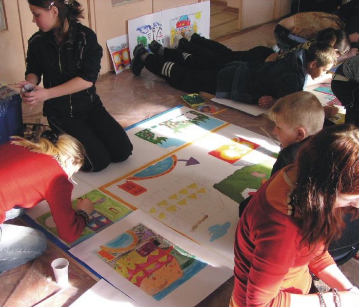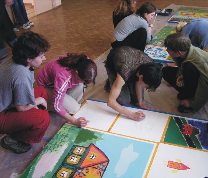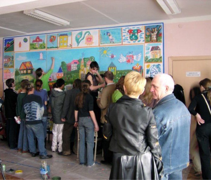 А дальше воспитанникам интерната было предложено придумать, вообразить место, где они хотели бы жить, и нарисовать его – дом своей мечты. И уже эти рисунки легли в основу панно, раскрашенного и установленного в фойе интерната. Здесь и пошли в дело краски, предоставленные для этой акции “Belinka”. Стена разрисовывалась по принципу «житейных» икон. По периметру было 24 поля для рисования отдельных, индивидуальных построек, а в центре был город.