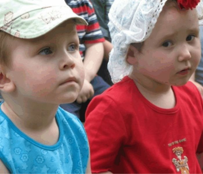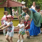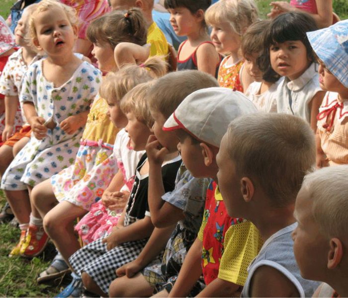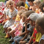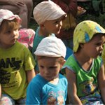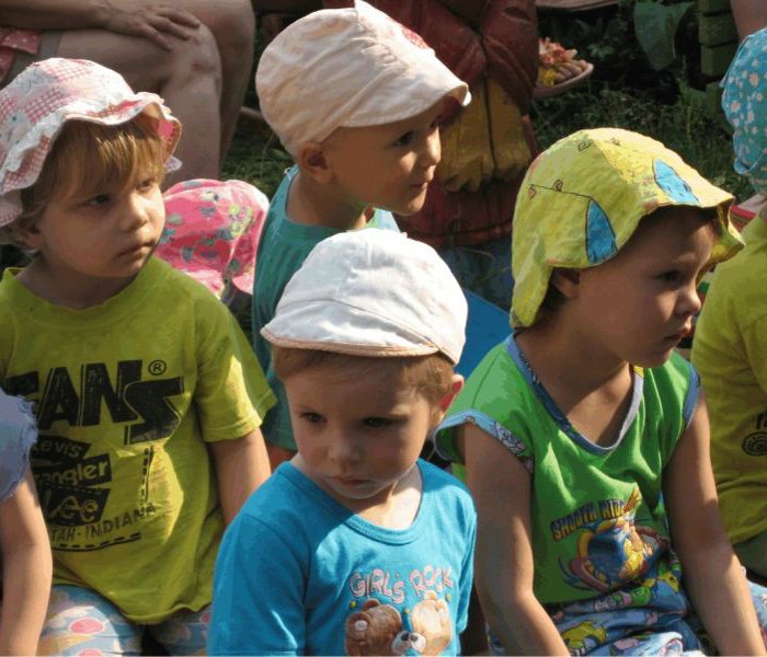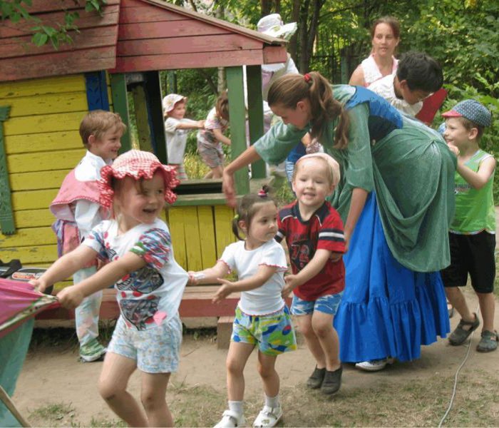 Пошел дождь, и мы вместе с маленькими зрителями спряталась в беседке. Пели песни, кидали шарики, играли. А потом дождь закончился, все выбежали и водили длинный паровоз. Первым шел Алексей Петрович с огромной трубой и дул в нее, как будто паровоз предупреждает о том, что он едет. И такая длинная важная цепочка обошла территорию детского дома и вернулась обратно к беседке.