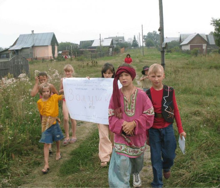 Так прошли две премьеры. Но нам предстоял еще один показ спектакля в деревеньке Нерожино, где был расположен наш лагерь. И этот третий показ поначалу не сулил никаких сказочных событий. Все начиналось более, чем буднично. Идея сыграть «Золушку» в деревне появилась, вообще, не от хорошей жизни. Дело в том, что во время нашей работы в Нерожино, случился конфликт с соседом, который, мягко говоря, не был рад пребыванию в его деревне непонятной группы. Многие соседи после этого конфликта были настроены против нас: что-то непонятное делают, в лес уходят на флейте играть, поют поздно вечером, в костюмы наряжаются… Воду из родника всю могут выпить. Не хотелось уезжать, оставив окружающих людей в таком настроении. Тем более, что наши партнеры из Детского дома «Ласточка» живут в похожей ситуации. Они создают у себя уют, семейную атмосферу, человеческие условия, но вокруг – обычная российская деревня, со всеми ее проблемами… Местные жители, которые завидуют, не понимают. А выпускникам «Ласточки», когда повзрослеют, идти именно в эту среду. И очень серьезный вопрос, как с этой средой наладить правильные отношения, - чтобы Детский дом и деревня помогали друг другу. Вообщем, это была еще одна причина, почему конфликт с местными жителями нужно было повернуть, нужно было найти выход. И вот, торосовские ребята в своих костюмах и с музыкальными инструментами отправились по всей деревне зазывать народ на спектакль. Подходили к каждому дому, трубили в трубы, били в бубны, рассказывали, что будет сегодня вечером.