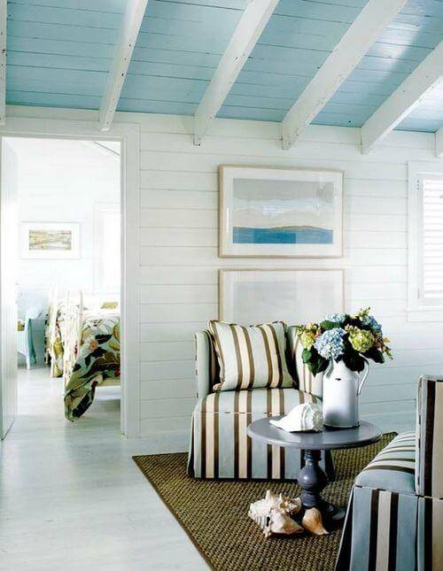 Потолок не обязательно должен быть белым или даже светлым. Но если потолок темный, светлым должно быть все остальное: стены, мебель, пол.
