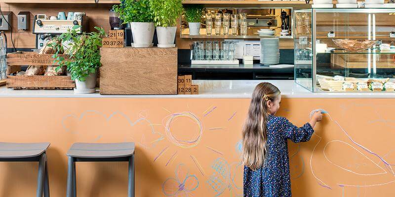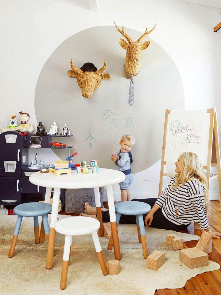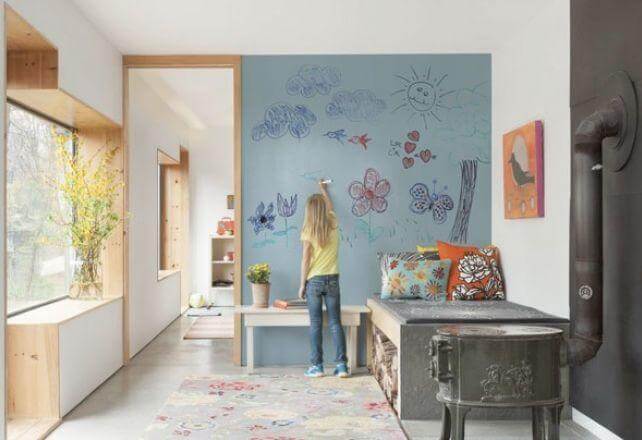 Звучит невероятно, но многие мамы знают, что брызги горячего шоколада и кусочки пластилина часто можно обнаружить даже на потолке. Так может проще перестраховаться и сразу покрасить моющейся акриловой или латексной краской еще и потолок?