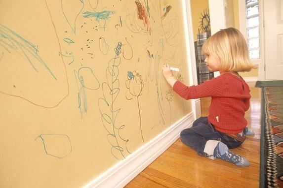Стенам в детской комнате достается по полной! По ним ездят машинками, их разрисовывают карандашами и маркерами, об них вытирают жирные ладошки, к ним приклеивают стикеры и пластилин, об стены бьют мячом, их царапают совками.